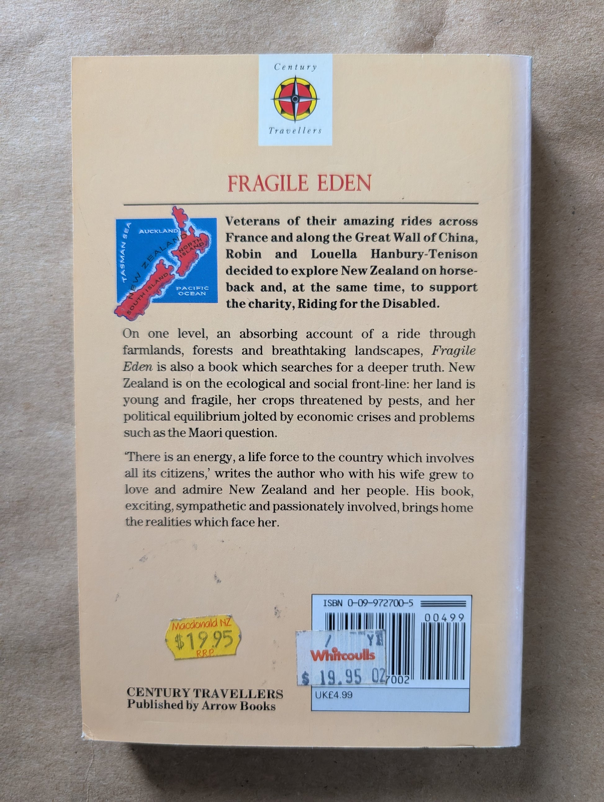 Robin and Louella Hanbury-Tenison rode across France on their white Camargue horses in 1984 and along the Great Wall of China two years later. Now they have decided to explore New Zealand on horseback, riding alone together through what they describe as some of the most dramatic and exciting country we have ever seen', and using the expedition to raise money for the charity, Riding for the Disabled. For two or three days at a time, Robin and Louella would map read their way by compass across some of the largest farms in the world, at one moment crossing snowy passes of over 6,000 feet, at the next baking in the dry summer heat of the valley floors. At night they would shelter from the rain and wind in primitive shepherds' huts, brewing up soup and tea to keep themselves warm.